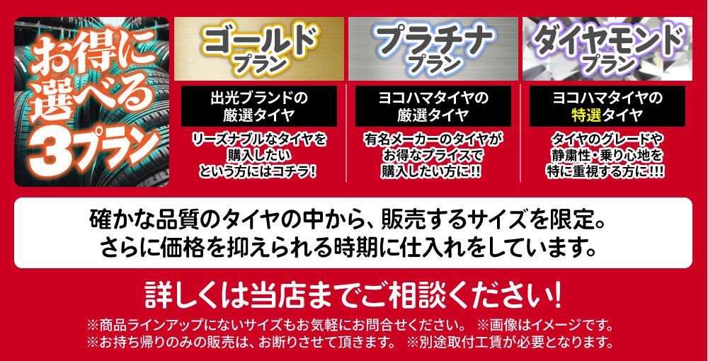 取り付けるタイヤをお客様ご自身で当店までお持ち込みください。 |